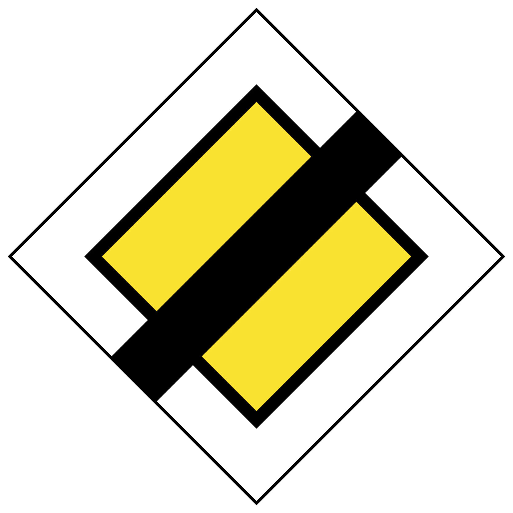 A yellow diamond with a white border indicates the start of a priority road. If you are travelling on this road, it means you have right of way. The ‘end of priority’ road is the same sign with a black line through it. This means you no longer have priority on the road.